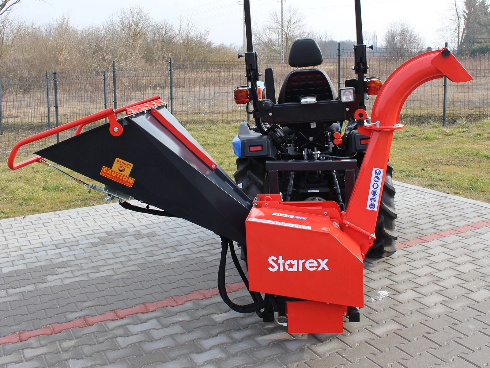 STAREX AXR 90 kardán hajtású dobos kialakítású ágaprító adapter, 10 cm vágási átmérővel, 18-50 LE teljesítményű traktorokhoz. Az aprítandó ágak adagolása a független hidraulikus rendszerű behúzóhengerrel törtnék.