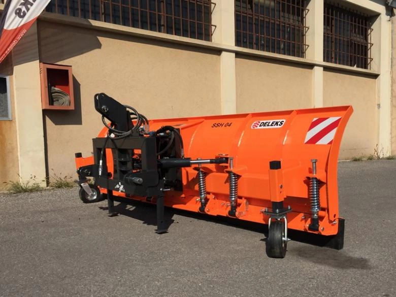 DELEKS SSH hótoló lapok, nagy teljesítményű traktorokhoz és más munkagépekhez, 3-pont függesztéssel. A jobb és bal oldali hidraulikus szögállítás a 2 db hidraulikus munkahenger segítségével történik. A biztonságos munkavégzést a 6 db ütésálló rugó teszi lehetővé, amely akadályba ütközés esetén visszaállítja az alap munkahelyzetbe eszközünket.
