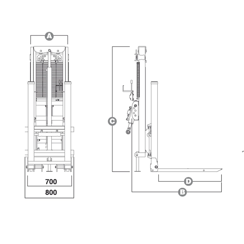 | Tipus | Teherbírás | Emelési magasság | Tömeg | Szélesség (A) | Hosszúság (B) | Magasság (C) | Villa hosszúság (D) | Nettó ár |
