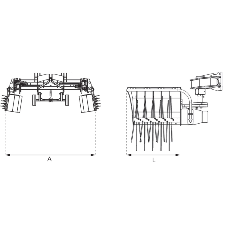 Műszaki adatok Sortávolság (A) : 2.500-3.600 mm Kefe fejek hosszúsága (L) : 500 mm Hidraulika teljesítmény : 35 l/p Hidraulikus oldalkitolás : 375 mm mindkét oldalon Hidraulika csatlakozás : közvetlenül a traktorhoz Függesztés : 3-pont, I-II-es kategória