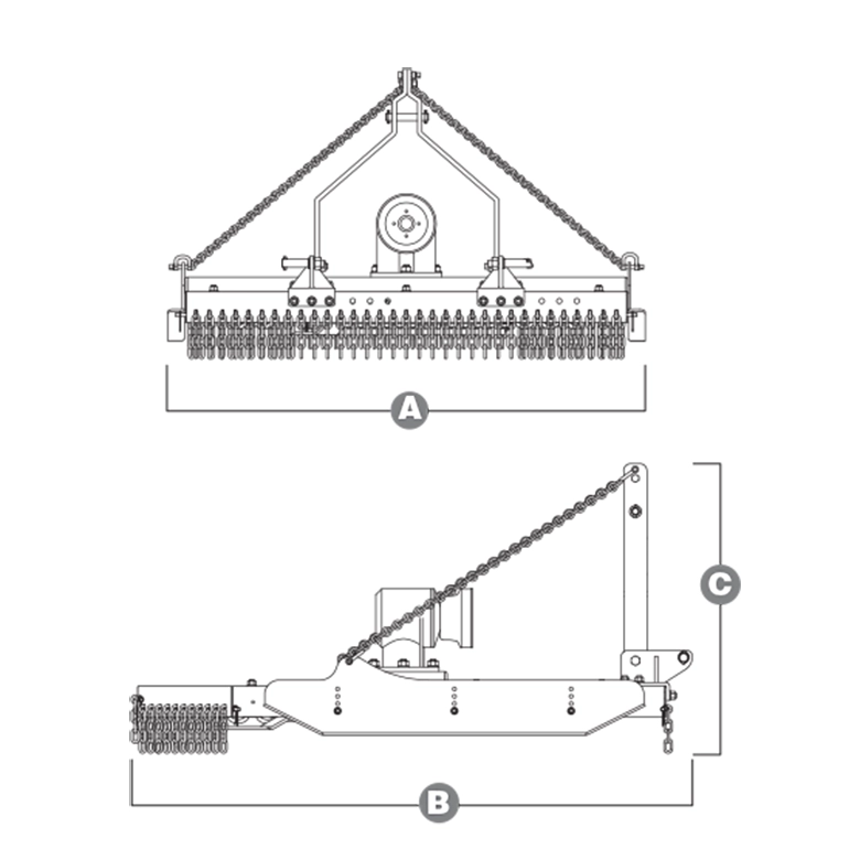 A talajkövetést és vágási magasságot a három pozícióban rögzíthető 8 mm anyagvastagságú csúszótalp és láncos függesztés biztosítja. A fűnyíró alváz 4 mm vastag acéllemezből készült. Függesztése a traktorra I-es kategóriás szabványos 3-pont csatlakozással történik.