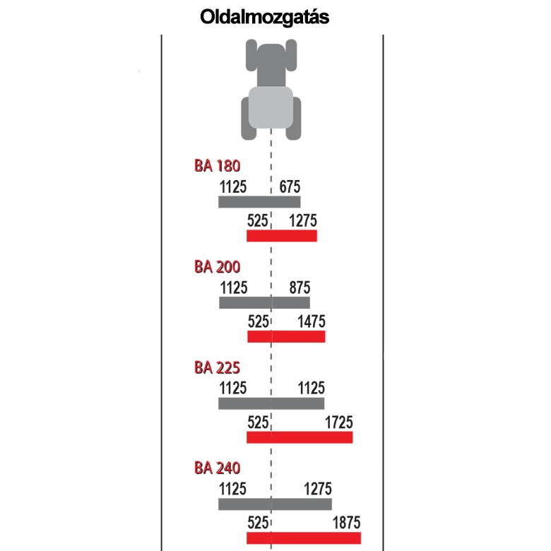 A széria gépei 180 - 200 - 225 - 240 cm munkaszélességgel rendelhetők. A BA típusok mechanikus, opcionálisan hidraulikus oldalmozgatás alapfelszereltséggel rendelhetők. A vágási magasság beállítása a nagy átmérőjű hátsó támasztóhenger segítségével történik.