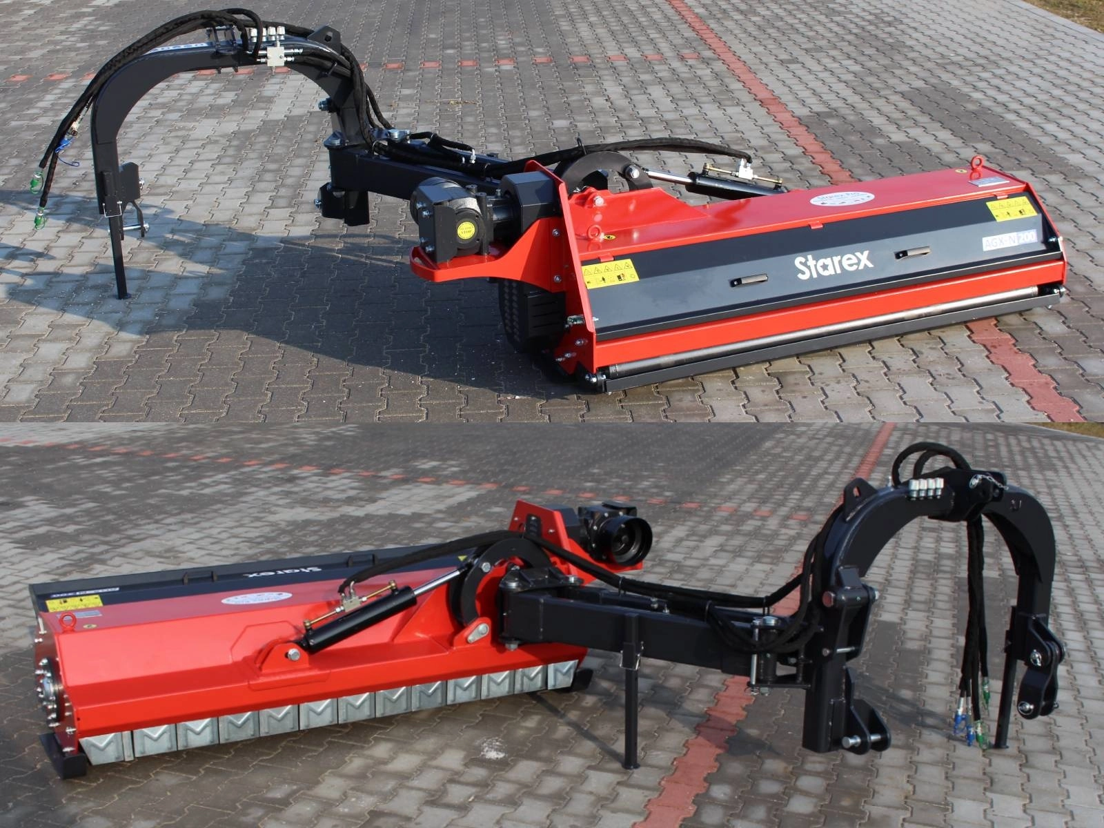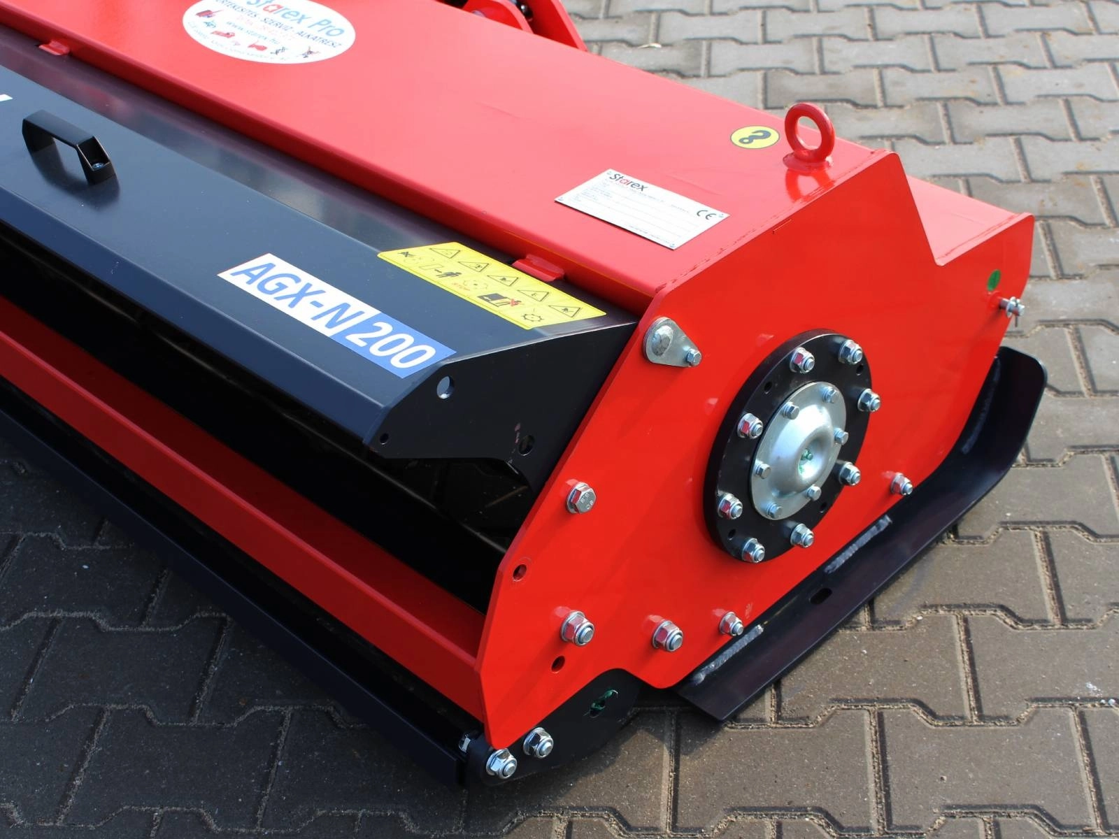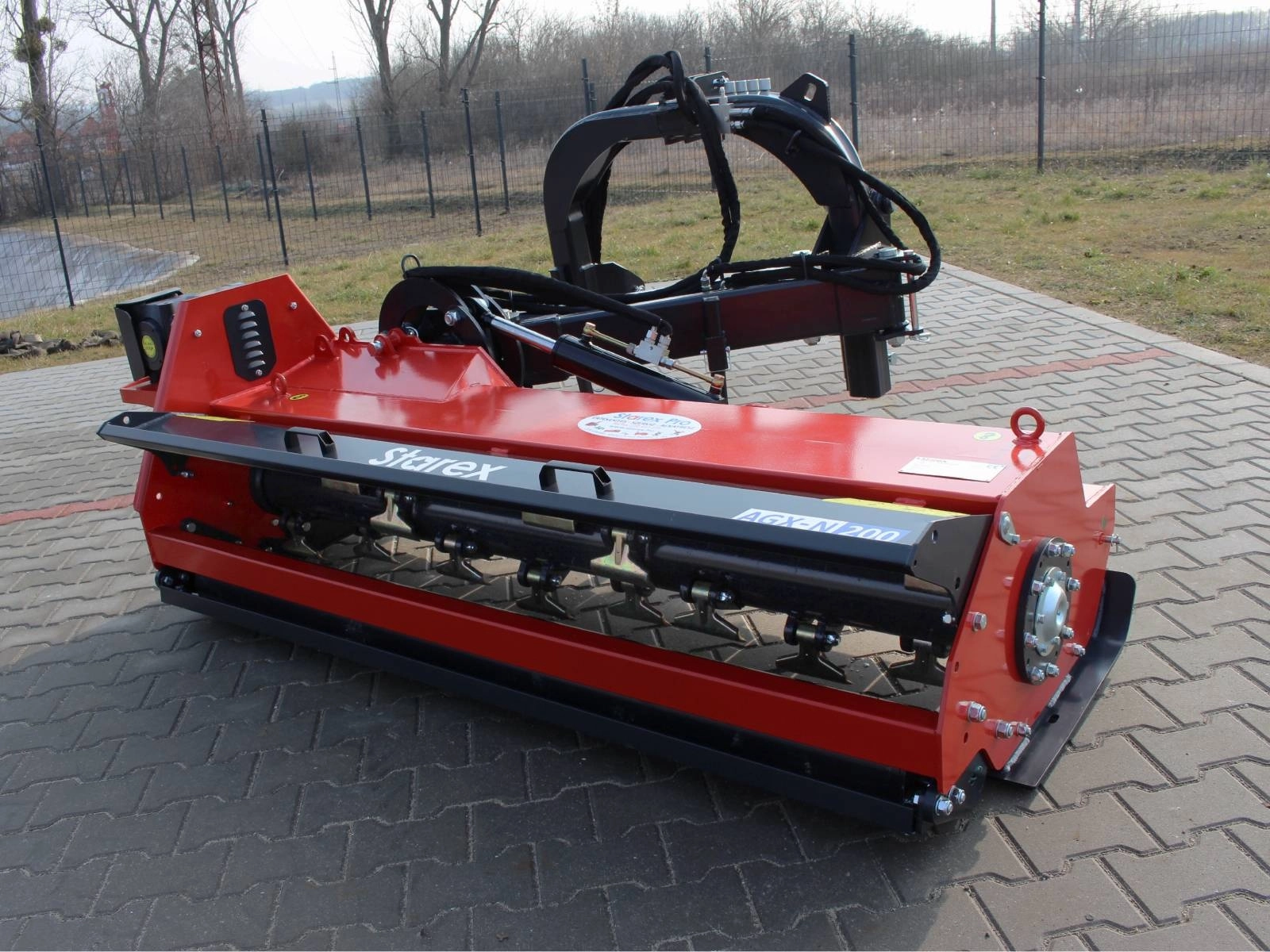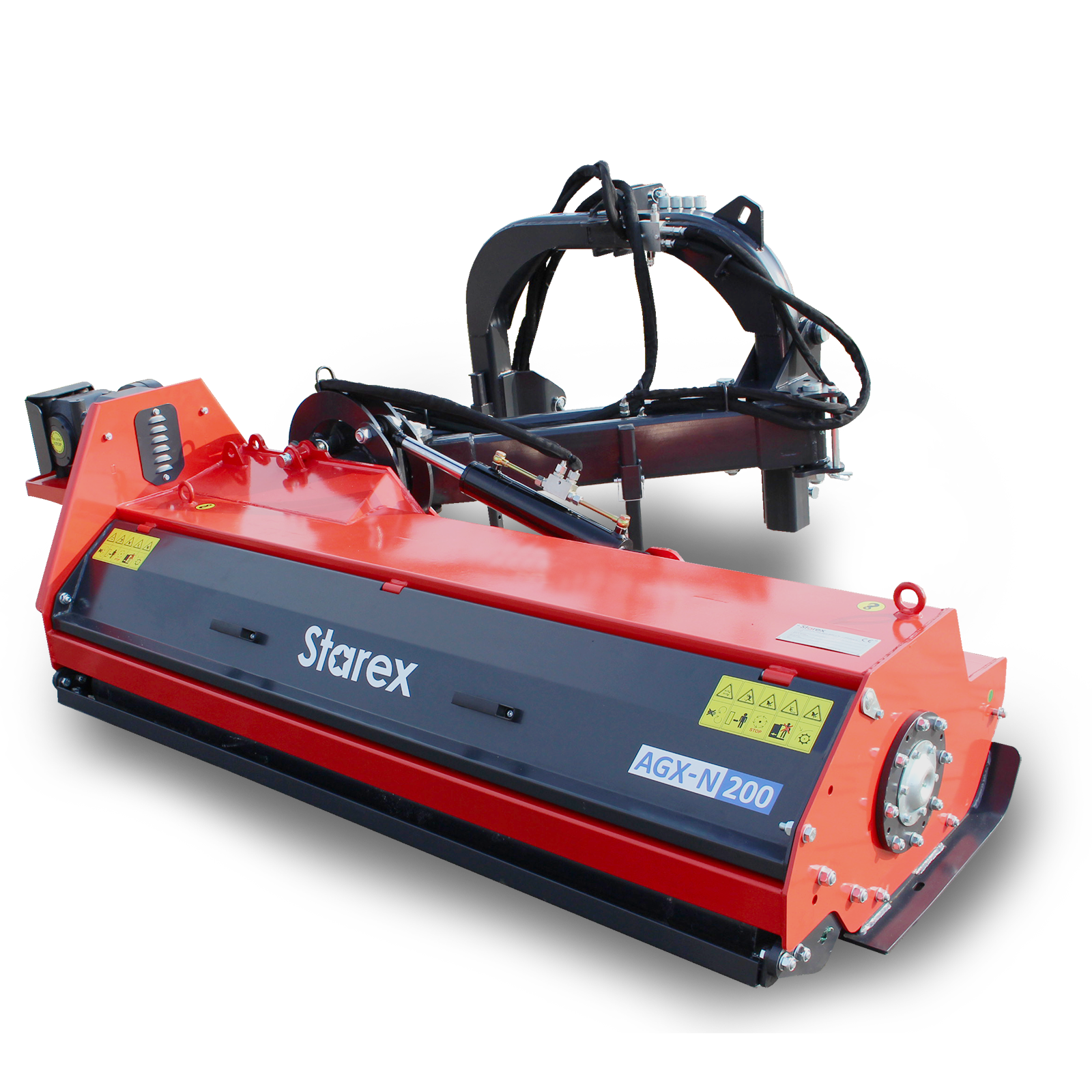 STAREX AGX-N 180-200 nyitható fedeles, rézsű vágására alkalmas robusztus építésű szárzúzók hidraulikus oldalmozgatással és dőlésszög állítással 70-120 LE teljesítményű traktorokhoz. Ideális munkagépek árokpartok, útpadkák, gyomos, gazos területek, gyümölcsösök tisztítására és bokrok, sövények vágására. A beépített biztonsági szelep védelmet nyújt az eszköz akadályba történő ütközése esetén.