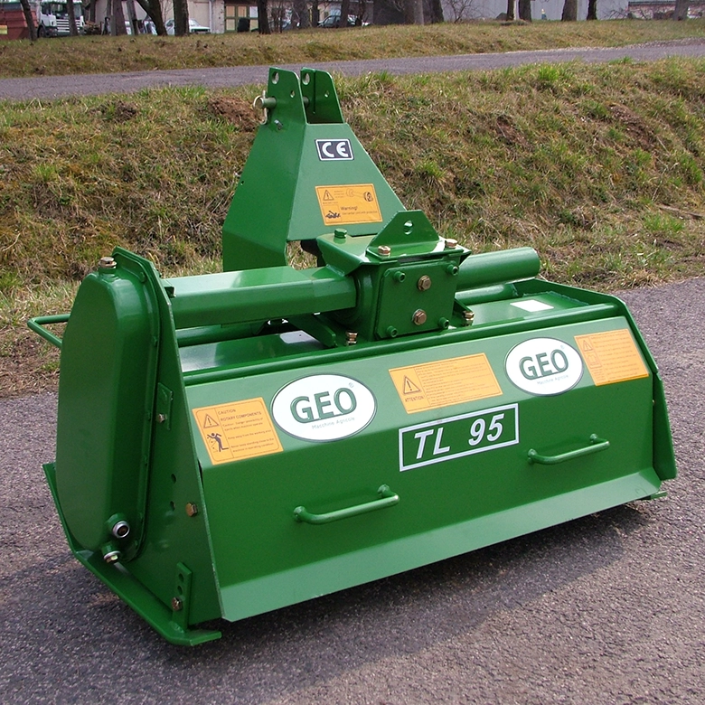 GEO TL 95-135 talajmaró, 25-40 LE teljesítményű traktorokhoz. Vasöntvény házú hajtóműve fix áttételű, lánchajtásos oldallehajtása automata láncfeszítésű. Egységenként négy darab marókéssel szerelve. A munkamélység kétoldali csúszótalpakkal állítható.
