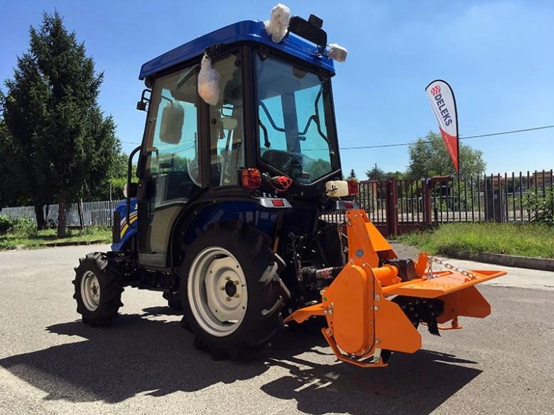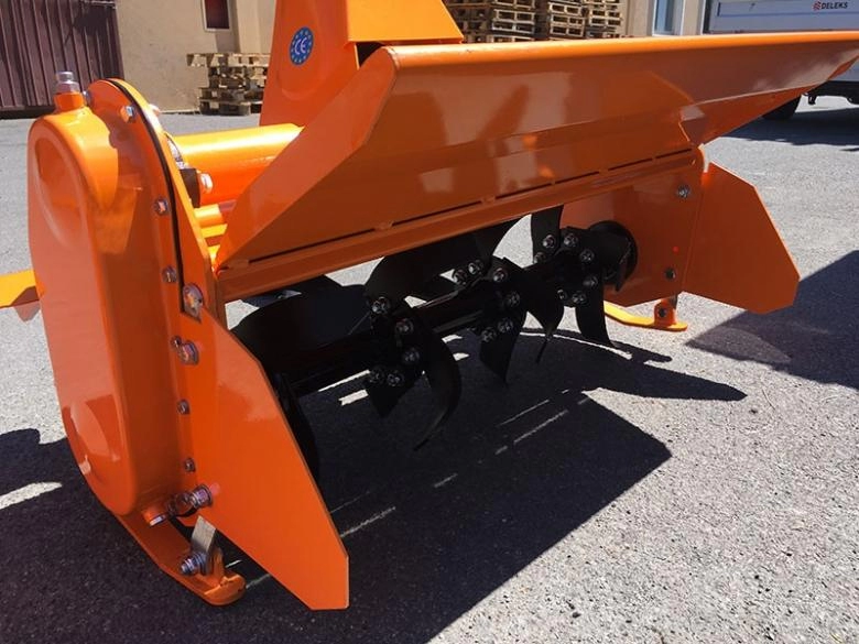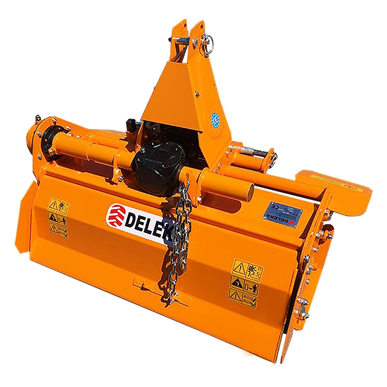 DELEKS DFL 95 könnyített talajmaró, 12-35 LE teljesítményű traktorokhoz. Vasöntvény házú hajtóműve fix áttételű, lánchajtásos oldallehajtása automata láncfeszítésű. Egységenként négy darab marókéssel szerelve. A munkamélység kétoldali csúszótalpakkal állítható.