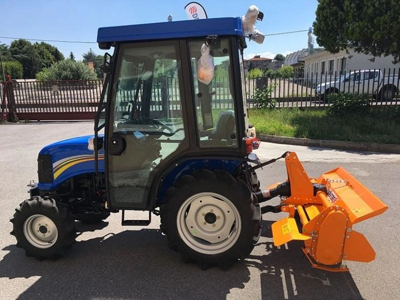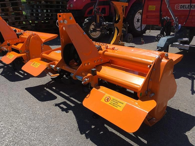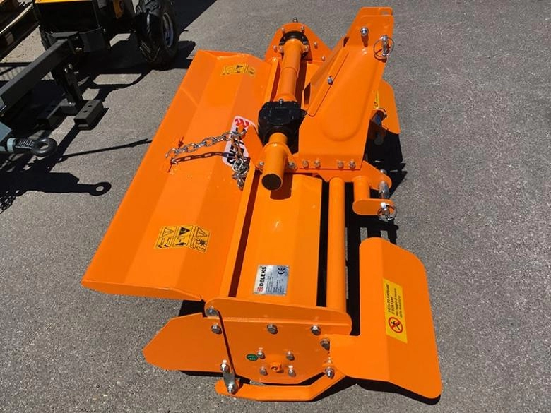 DELEKS DFL 135 talajmaró, 18-35 LE teljesítményű traktorokhoz. Vasöntvény házú hajtóműve fix áttételű, lánchajtásos oldallehajtása automata láncfeszítésű. Egységenként négy darab marókéssel szerelve. A munkamélység kétoldali csúszótalpakkal állítható.